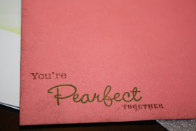 | Using the "Pearfect", "You're special", and "Together Forever" stamps I removed the parts I didn't want and combined the parts I did want to get "You're Pearfect Together". |